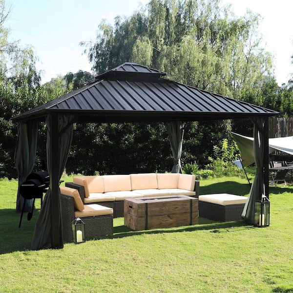 12 ft. W x 12 ft. D Hardtop Gazebo Aluminum Double Roof Metal Gazebo with Curtain and Netting