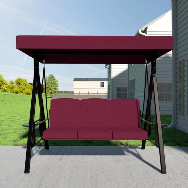 3-Seat Converting Canopy Patio Swing Steel Lounge Chair with Cushions in Burgundy Red