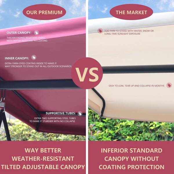 3-Seat Converting Canopy Patio Swing Steel Lounge Chair with Cushions in Wine Red
