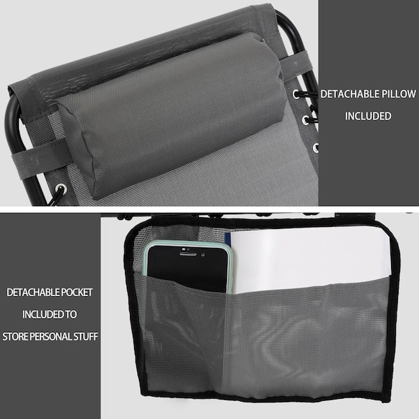 Metal Outdoor Folding Chaise Lounge Chair with Pillow and Pocket in Dark Gray