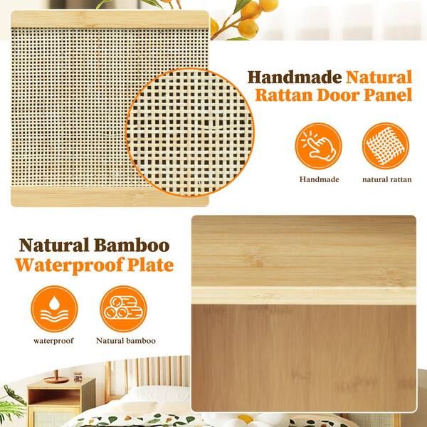 Yellow Bamboo Nightstands Accent Storage Cabinets Side End Table with Rattan Doors and Storage Cube (Set of 2)