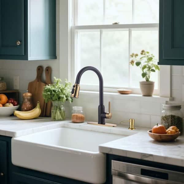 15 in. Stainless Steel Single Handle 360° Pull Down Sprayer Kitchen Faucet with Soap Dispenser in Black and Gold