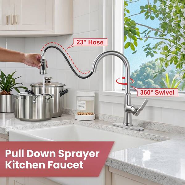 17 in. H Single Handle Pull Down Sprayer Kitchen Faucet with 3-Spray and 360° Spout Swivel Mode in Brushed Nickel
