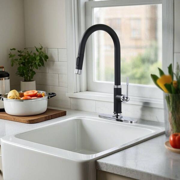 17 in. Single Handle Metal Pull Down Sprayer Kitchen Faucet with 360° Swivel Spout and Supply Hoses in Black and Chrome
