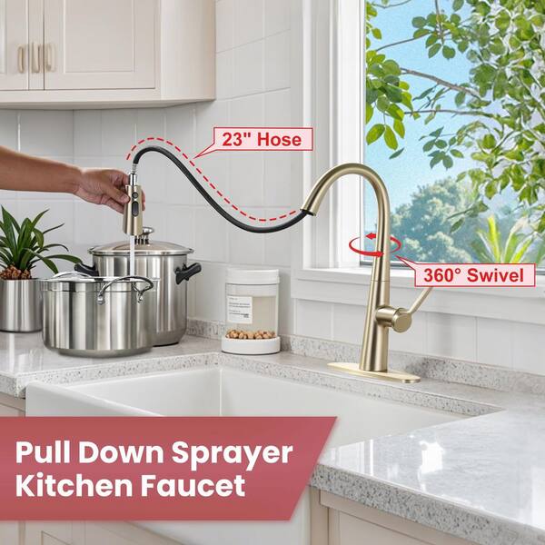 18 in. H Single Handle Pull Down Sprayer Kitchen Faucet with 3-Spray and 360° Spout Swivel Mode in Gold