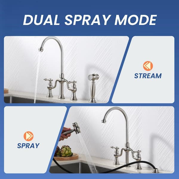 2-Handle Bridge Kitchen Faucet with Side Sprayer in Brushed Nickel
