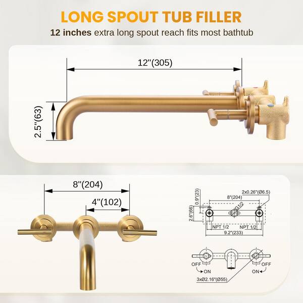 2-Handle Wall Mount Roman Tub Faucet with 12 in. Long Spout Reach in. Brushed Gold (Valve Included)