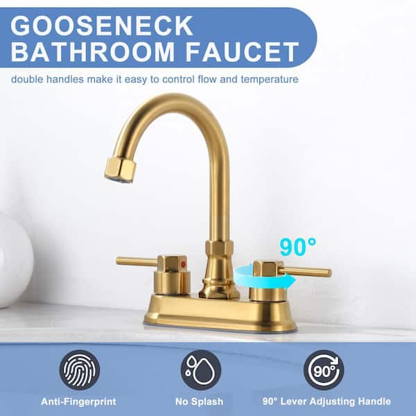 4 in. Centerset Double Handle High Arc Bathroom Faucet with Drain Kit and Water Inlet Pipes Included in Brushed Gold