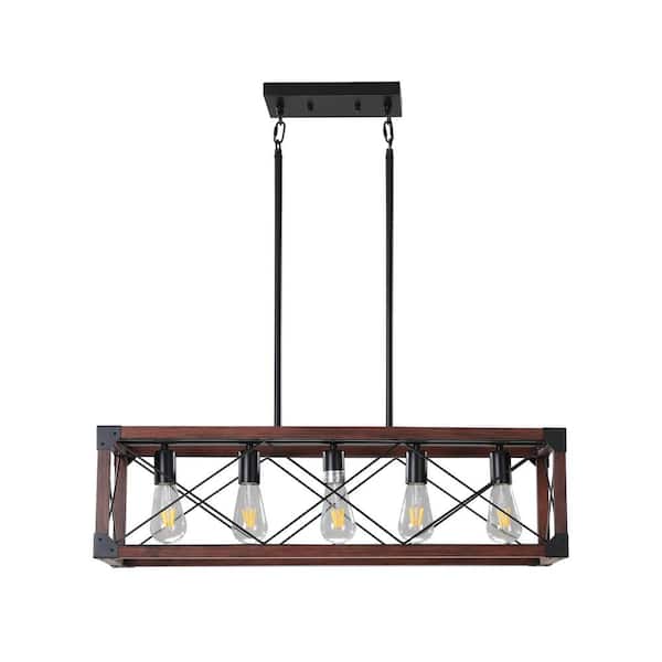 5-Light Red and Black Wood Farmhouse Linear Chandelier with Rustic Rectangle Frame and Adjutsable Height (No Bulbs)