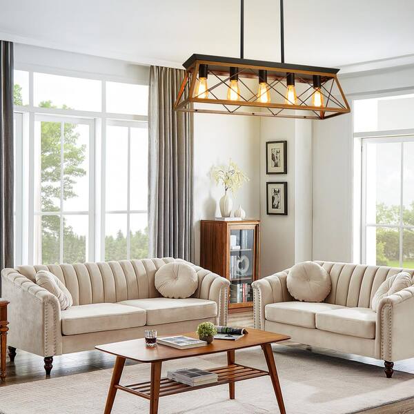 5-light Walnut Wood Farmhouse Linear Chandelier with Rectangle Frame and Adjustable Height for Kitchen Island (No Bulbs)