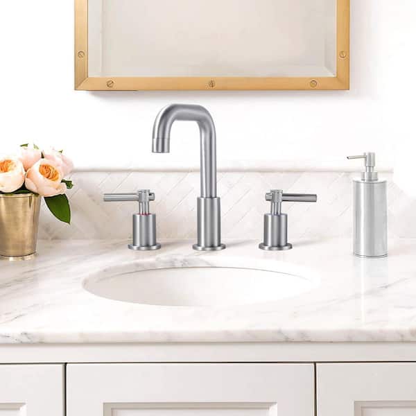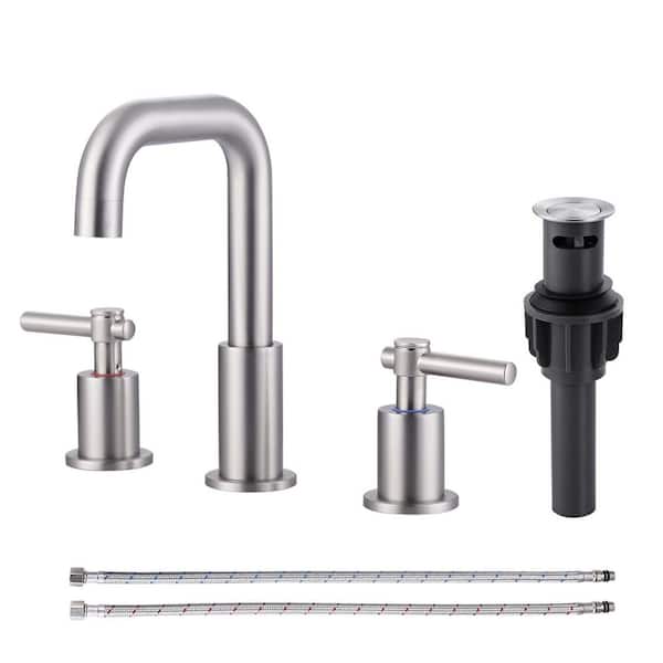 8 in. Widespread Double Handle High Arc Bathroom Faucet with Drain Kit Included and Supply Line in Brushed Nickel