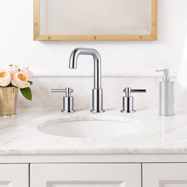 8 in. Widespread Double Handle High Arc Bathroom Faucet with Drain Kit Included and Supply Line in Polished Chrome