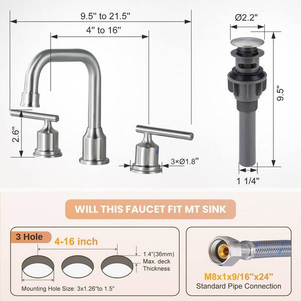 • Includes pop up drain stopper, water supply lines, hardware