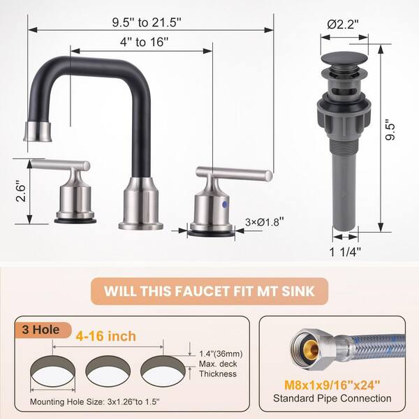 8 in. Widespread Double Handle High Arc Bathroom Faucet with Drain Kit Included in Brushed Nickel and Black