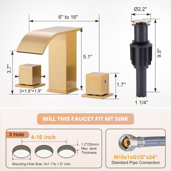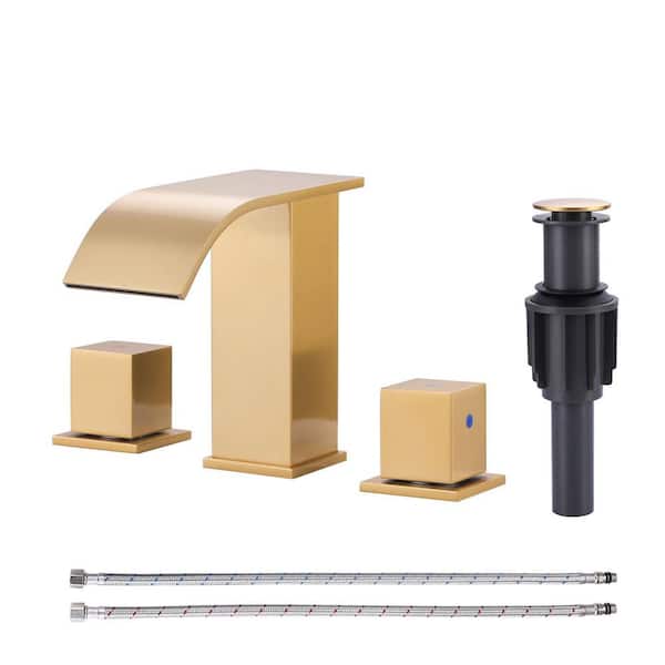 8 in. Widespread Double Switch Waterfall Bathroom Faucet with Pop-Up Drain in Brushed Gold