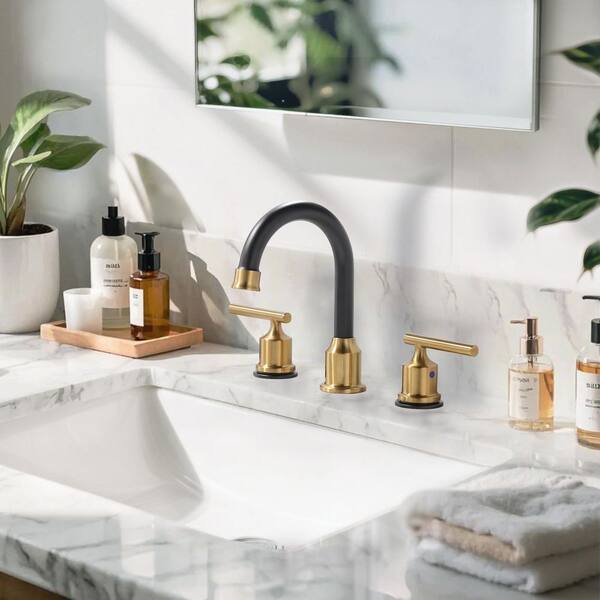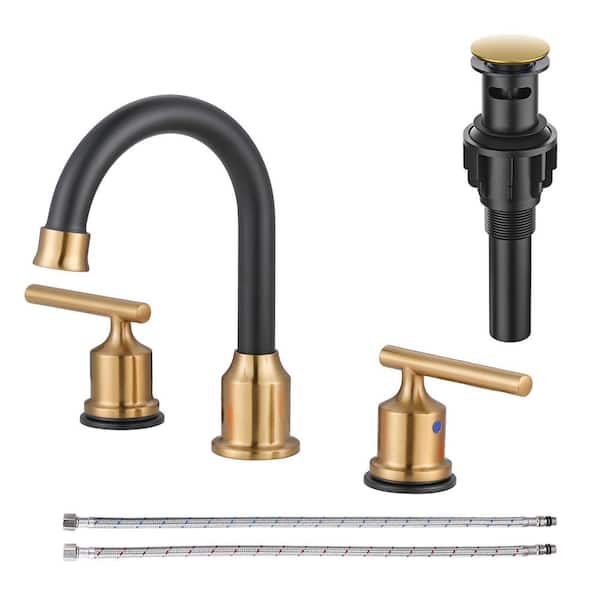 8 in. Widespread Stainless Steel Double Handle Bathroom Faucet with Pop Up Drain and Supply Hoses in Black and Gold