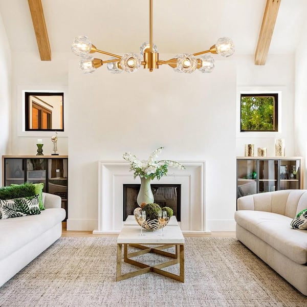 9-Light Rustic Mid Century Sputnik Linear Chandelier Hanging Fixture Ceiling Light for Kitchen Island in Gold