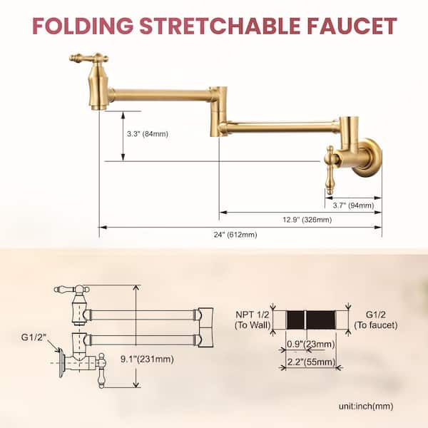 Brass Wall Mounted Pot Filler Double Joint Swing Arms Kitchen Faucet with 360° Spout Swivel in Gold