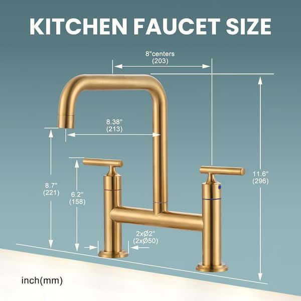 Double Handle Bridge Faucet with Kitchen Sink Hole Cover and 360° Swivel Spout in Brushed Gold