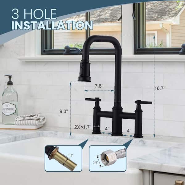 Double Handle Bridge Kitchen Faucet with 360 Degree Spout Swivel in Matte Black