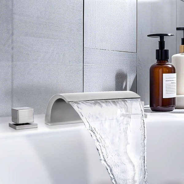 Double-Handle Tub Deck Mount Roman Tub Faucet Waterfall Bathtub Filler in Brushed Nickel