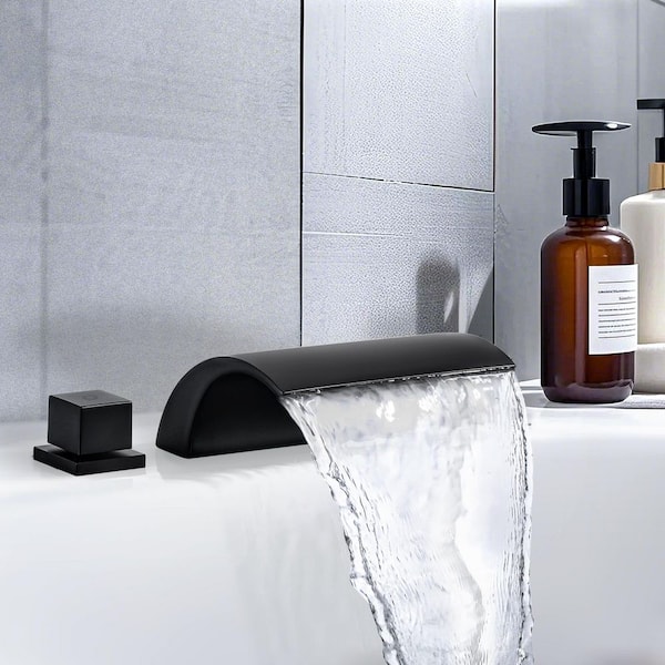 Double-Handle Tub Deck Mount Roman Tub Faucet Waterfall Bathtub Filler in Matte Black
