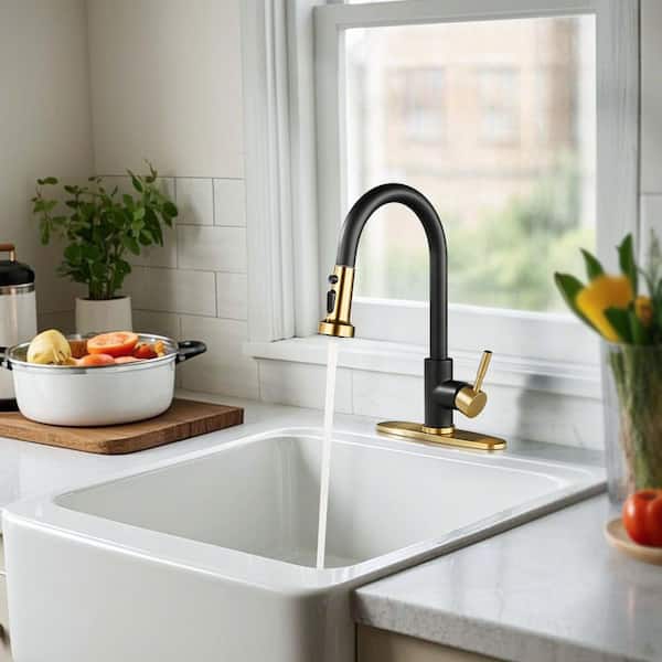 Gold and Black 15 in. H Single Handle Pull Down Sprayer Kitchen Faucet with 360° Spout Swivel and 3-Spray Mode