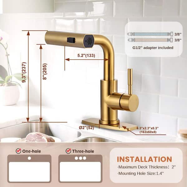 Modern Single Handle Pull Down Bar Faucet with 3-Modes Sprayer and Deckplate in Brushed Gold