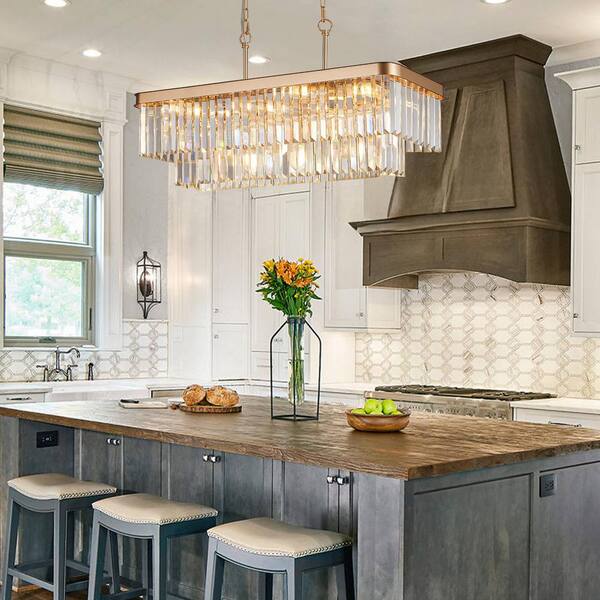 Rectangular 11-Light Gold Crystal Chandelier Iron Ceiling Hanging Light for Kitchen Island (Bulb Not Included)