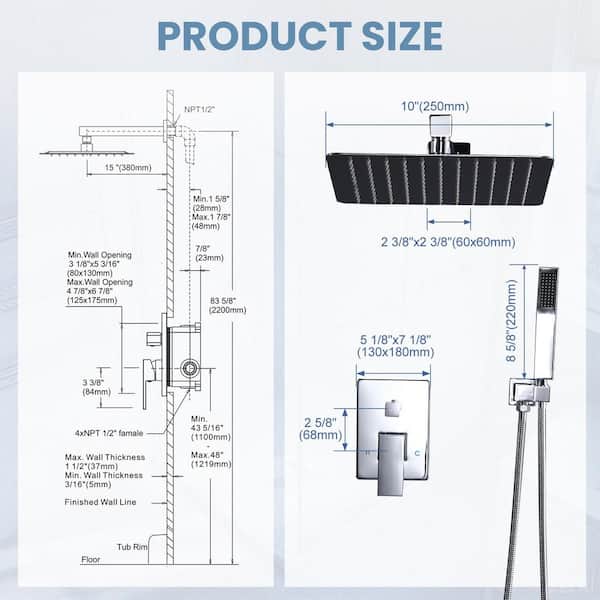 Single Handle 2-Spray Dual Wall Mount Shower Faucet 1.8 GPM with 10 in. Square Adjustable Shower Head in Polished Chrome