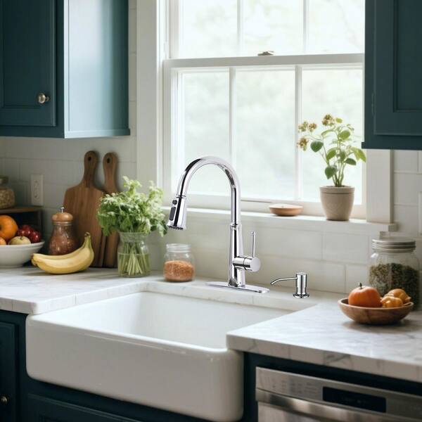 Single Handle Pull Down Sprayer Kitchen Faucet with Soap Dispenser and Deck Plate Included in Polished Chrome
