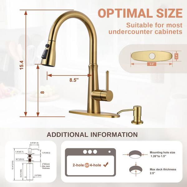 Single Handle Stainless Steel Pull Down Sprayer Kitchen Faucet with Soap Dispenser in Brushed Gold