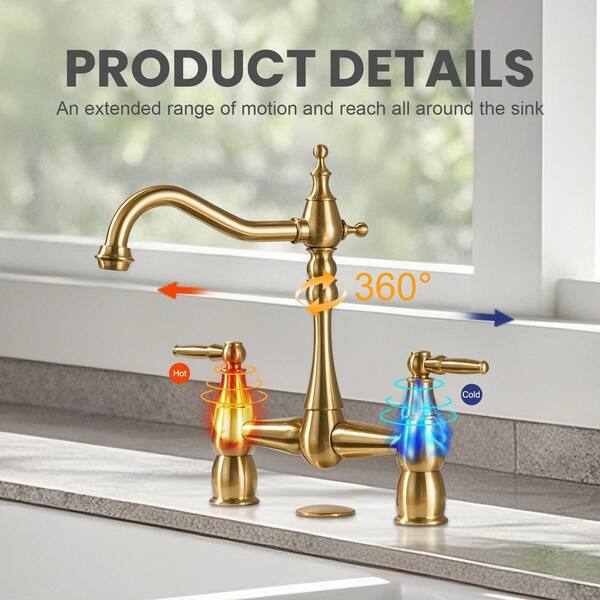 Vintage 2-Handle High Arc Bridge Kitchen Faucet with Hole Cover in Gold