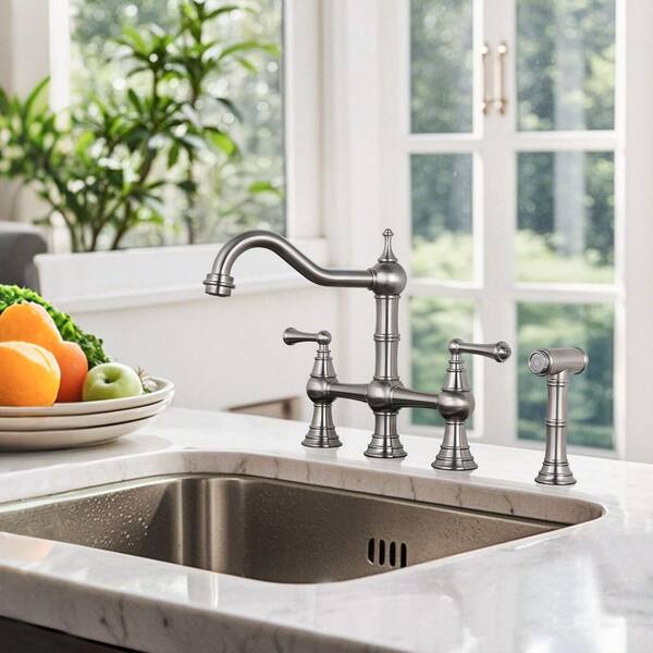 Vintage Double Handle Bridge Kitchen Faucet with Side Sprayer in Brushed Nickel