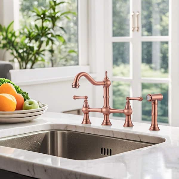 Vintage Double Handle Bridge Kitchen Faucet with Side Sprayer in Copper