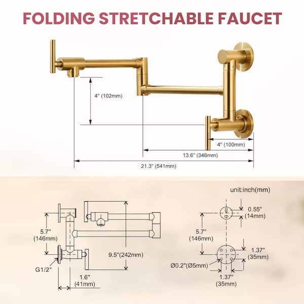 Wall Mounted Pot Filler 2-Handles Kitchen Faucet with 360° Spout Swivel in Brushed Gold