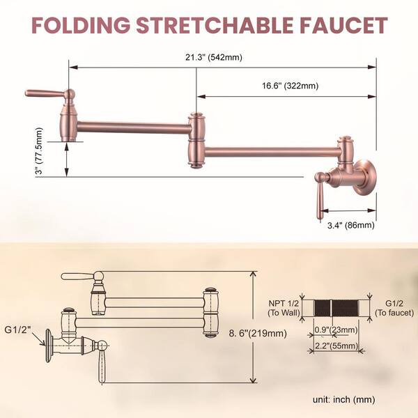 Wall Mounted Pot Filler 2-Handles Kitchen Faucet with 360° Spout Swivel in Copper
