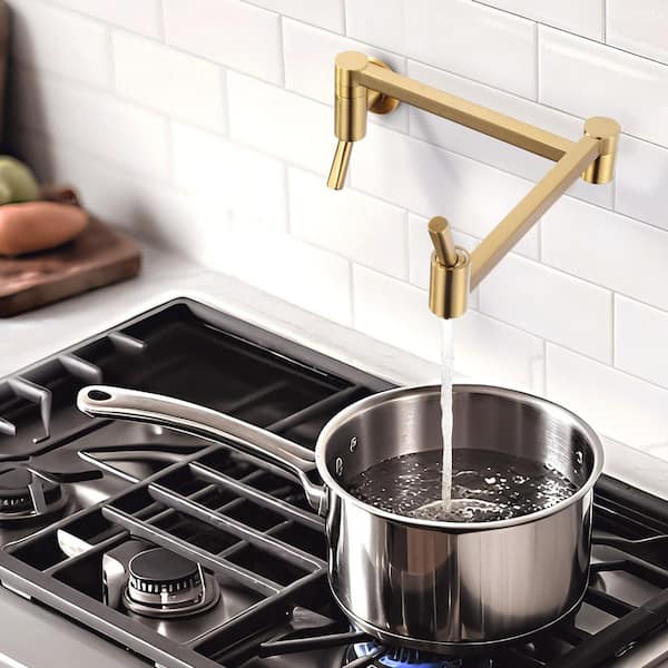 Wall Mounted Pot Filler Kitchen Faucet with Double Handles and 360° Spout Swivel in Brushed Gold