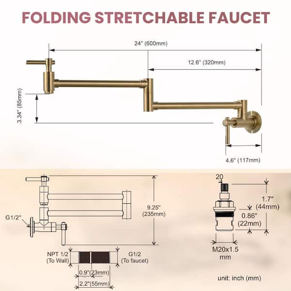 Wall Mounted Pot Filler Kitchen Faucet with Double Handles and 360° Spout Swivel in Brushed Gold