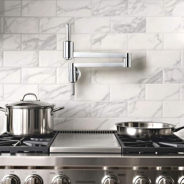 Wall Mounted Pot Filler Kitchen Faucet with Double Handles and 360° Spout Swivel in Polished Chrome