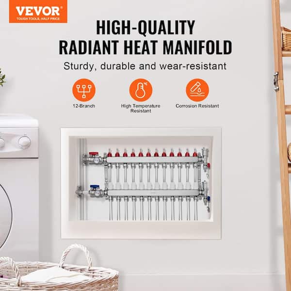 12-Branch Radiant Heat Manifold,1/2 in. PEX Tubing Manifold, Stainless Steel PEX Manifold, Radiant Heat PEX Manifold Kit
