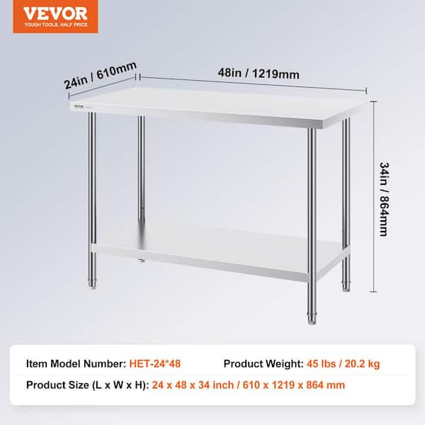 24 x 48 x 34 in. Stainless Steel Commercial Kitchen Prep Table Silver 800 lbs. Load with 3-Adjustable Height