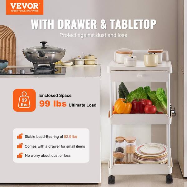 3-Tier Rolling Utility Cart with Drawer Multi-function Storage Trolley Kitchen Cart w/Handle and Lockable Wheels, White