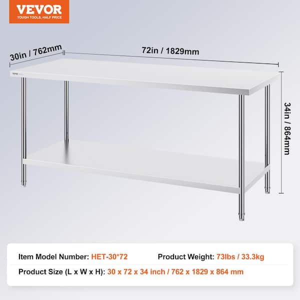 30 in. x 72 in. x 34 in. Silver Stainless Steel Commercial Kitchen Prep Table 920 lbs. with 3 Adjustable Height Levels
