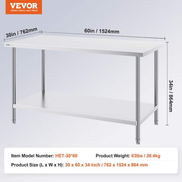 30 x 60 x 34 in. Stainless Steel Commercial Kitchen Prep Table 910 lbs. Load Capacity with 3 Adjustable Height Levels