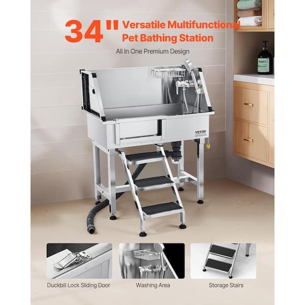 34 in. Pet Dog Bathing Station w/Ramp Professional Stainless Steel Dog Grooming Tub w/Drawer Pet Furniture Cover Left