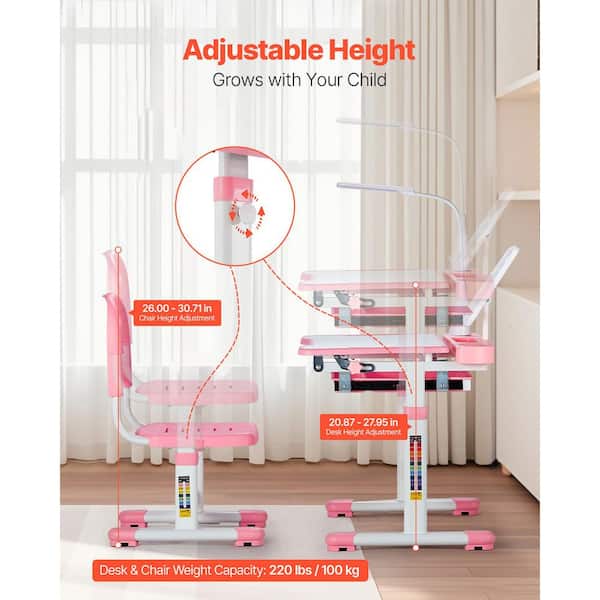Kids Study Chair and Desk Set, Study Desk and Chair for Kids with Table Lamp, Adjustable Height and 0-40° Tilted Desktop