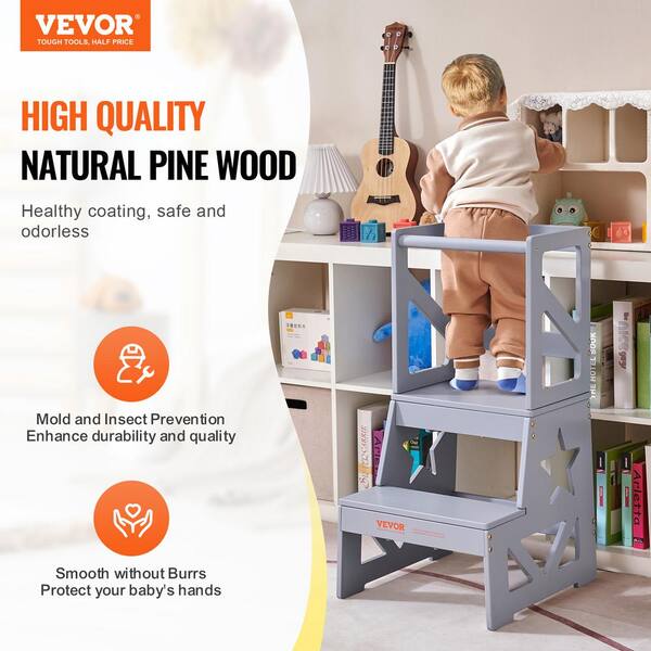 Natural Pine Wood Toddler Step Stool 150 Lbs. Load Standing Tower Learning Stool with Safety Rail for Home Kids, Gray