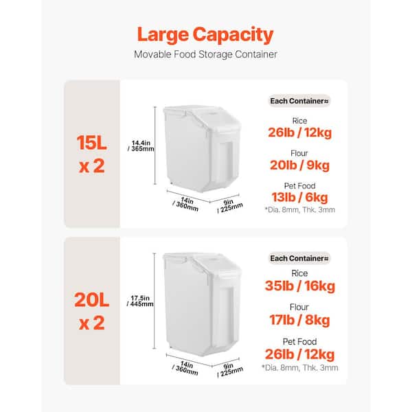 Rice Storage Container, 3.5 Gal./15 L x 2 + 4.5 Gal./ 20 L x 2 Large Dog Food Dispenser Bin, Kitchen Ingredient Cereal