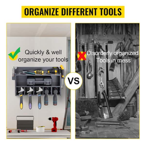 Wall Mount Drill Holder 5-Drill Hanging Slot Power Tool Organizer 2-Shelf Polished Wooden Toolbox for Wrench, Black